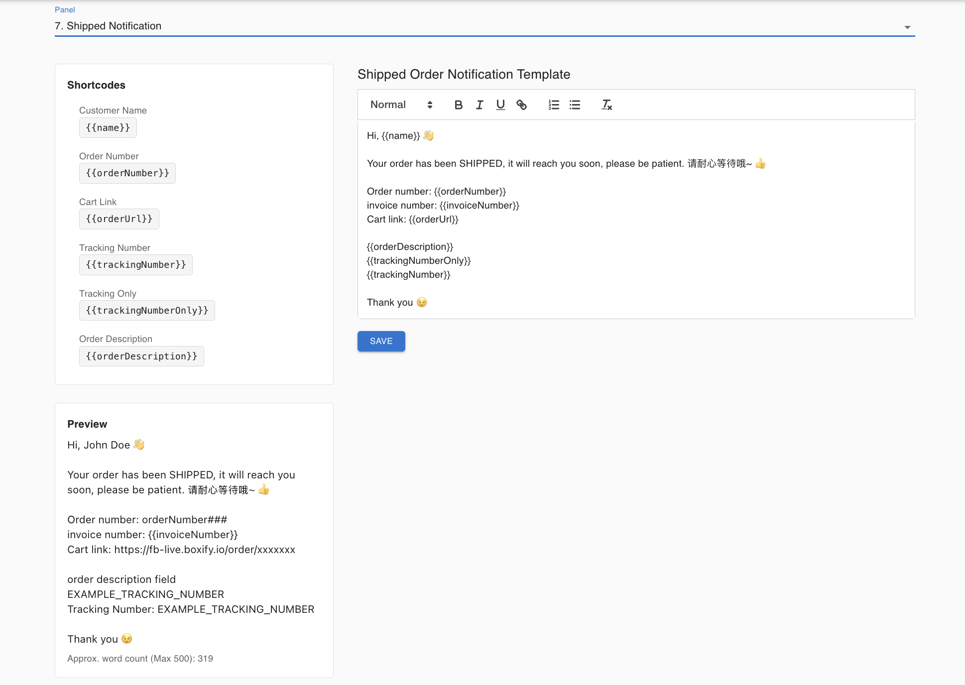 By default, Boxify provides a Standard Shipped Notification.