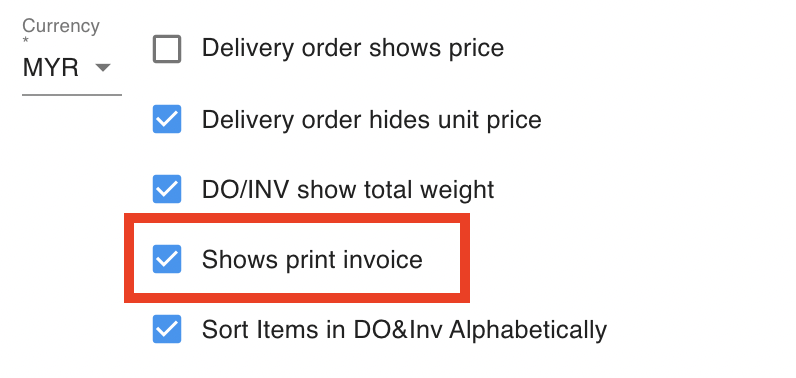 Enable the Print Invoice option