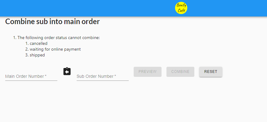 Enter the two order numbers you want to merge. Put the master order on the left and the sub-order on the right. Click PREVIEW to check the details before confirming.